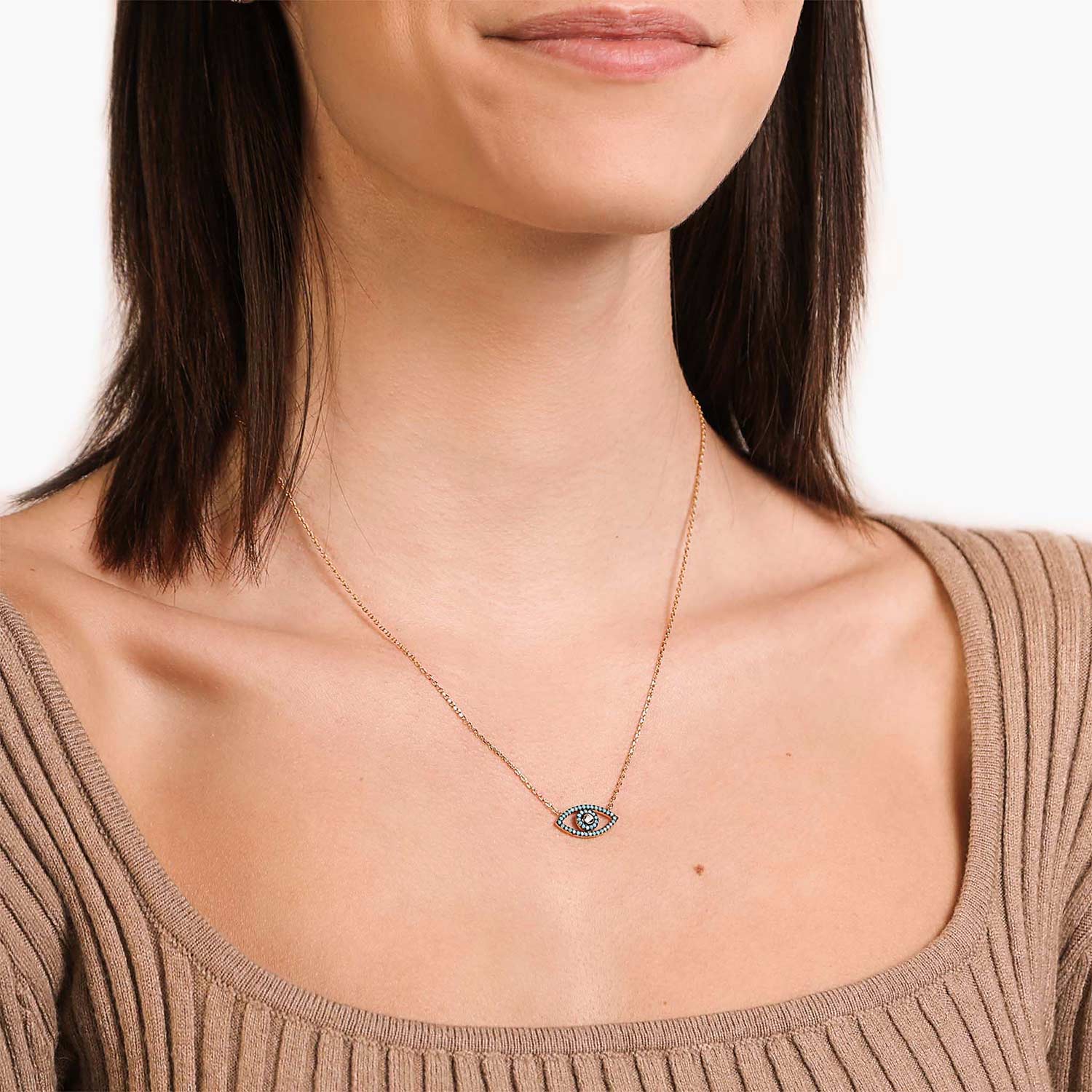 The Cleo evil eye necklace will be your new favorite lucky necklace. With a gorgeous 14K gold over a sterling silver 925 base featuring eye-catching turquoise stone and a cubic zirconia stone at the center, this necklace will complement any look. Perfect for a night out or a day in the office, this evil eye necklace will bring you extra luck and sparkle.