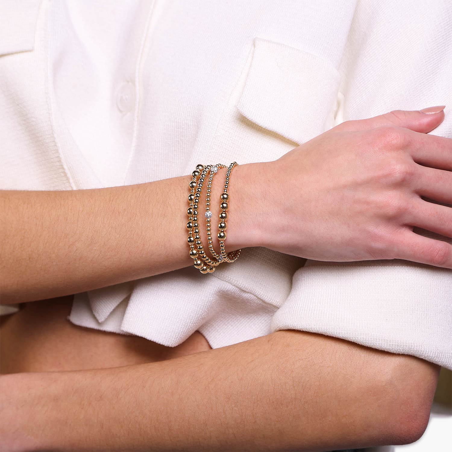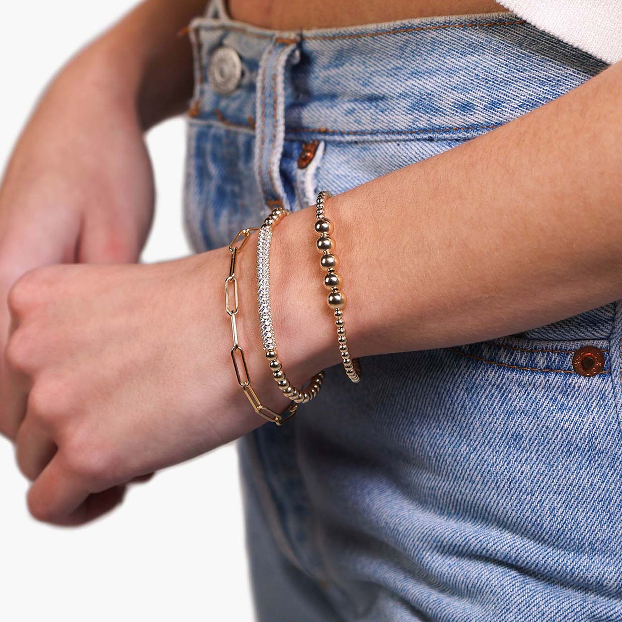The Riley bracelet is the perfect example of an eye-catching piece that is both noticeable and subtle. Featuring 3 mm 14K gold filled beads on the entire bracelet, including five center 6 mm beads for a little extra personality, this bracelet comes with interior elastic that makes it comfortable for everyday way. A great gift for a special someone or a way to treat yourself, this bracelet is sure to impress.