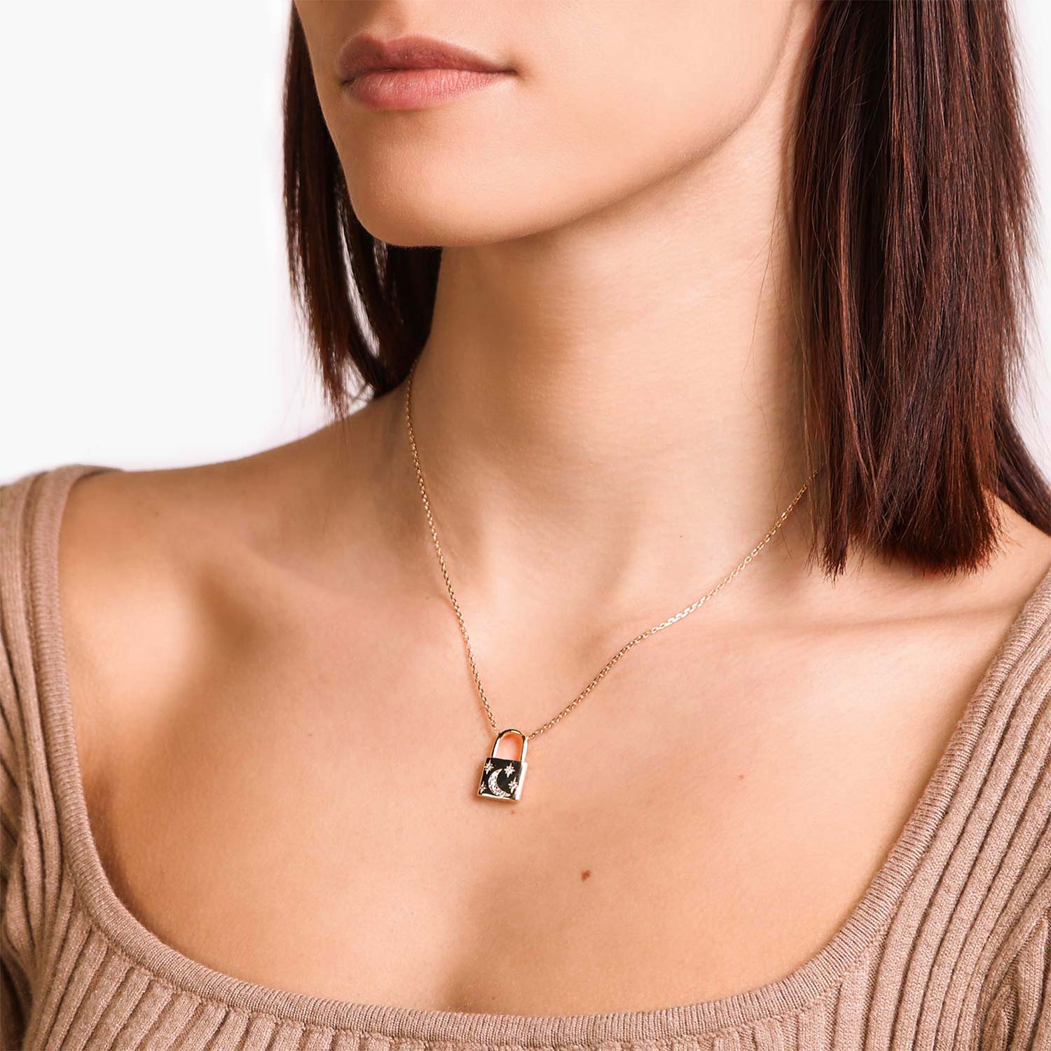 The Aurora necklace is a breathtaking locket necklace that brings together beauty, class, and sparkle. This necklace features a stunning lock with a crescent moon filled with cubic zirconia stones. Surrounding the moon are stars made of cubic zirconia stone. The lock is 14K gold over sterling silver, bringing you quality and style all in one.
