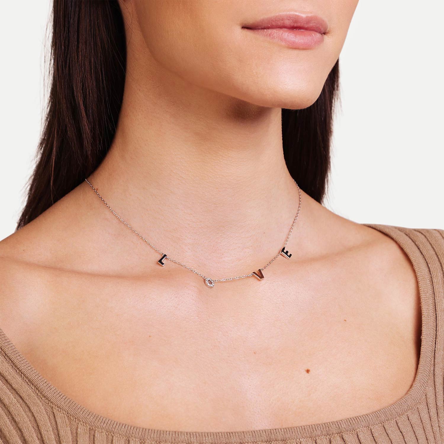 The Lily necklace is a necklace you're sure to "l-o-v-e." This sterling silver 925 necklace features the word "love" spelled out across a delicate but sturdy chain. Drawing attending to the "o" are glittering cubic zirconia stones to fill out the shape of the letter. This necklace is trend-setting and charming, making it the perfect gift for someone you care for - or a way to treat yourself to a new favorite addition to your jewelry collection.
